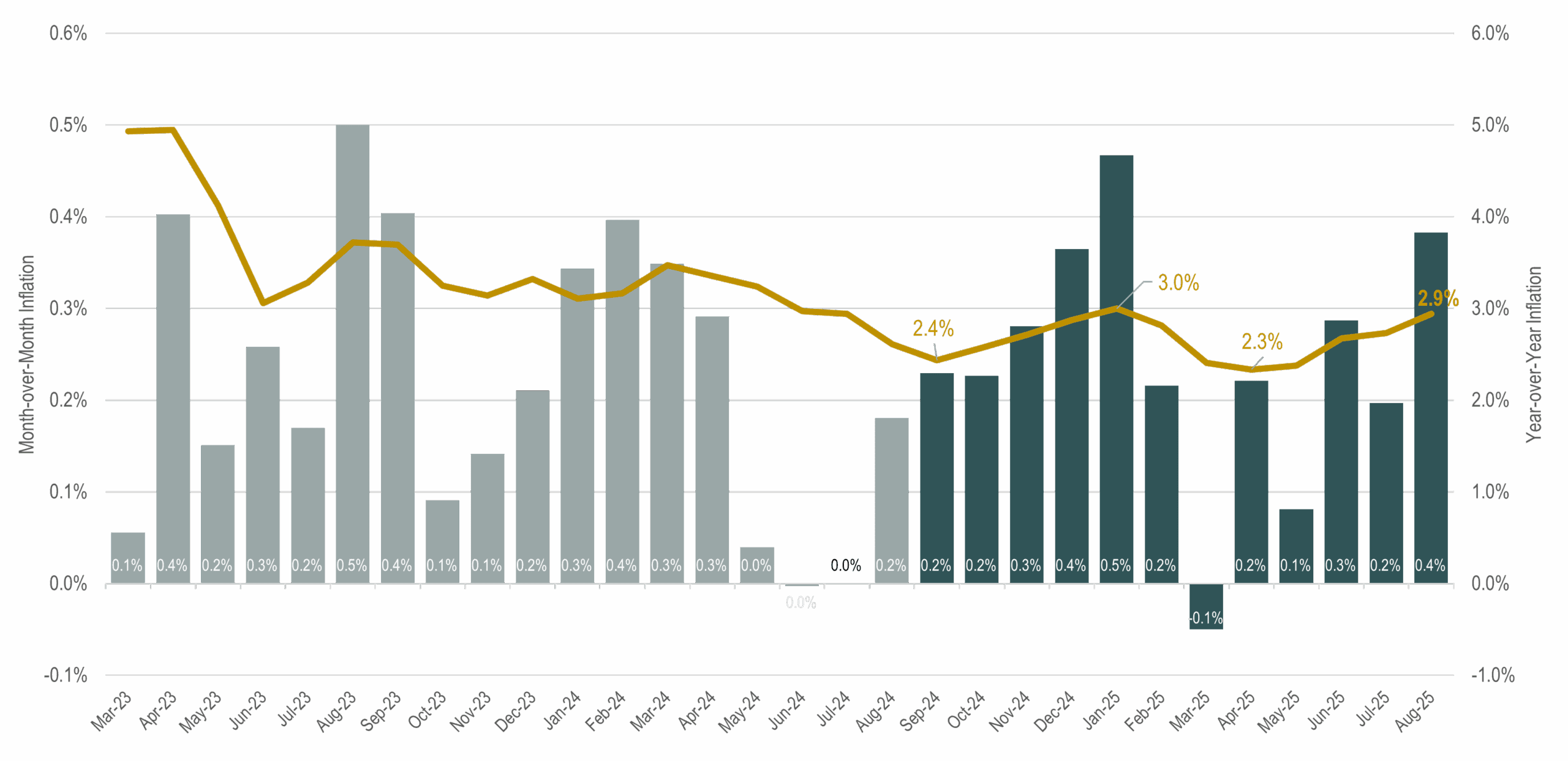 About this Slide: This chart shows month-over-month inflation (bars, left axis) and year-over-year inflation (line, right axis). Bars shaded in dark blue represent the most recent 12-month period, over which inflation averaged 2.9%.
