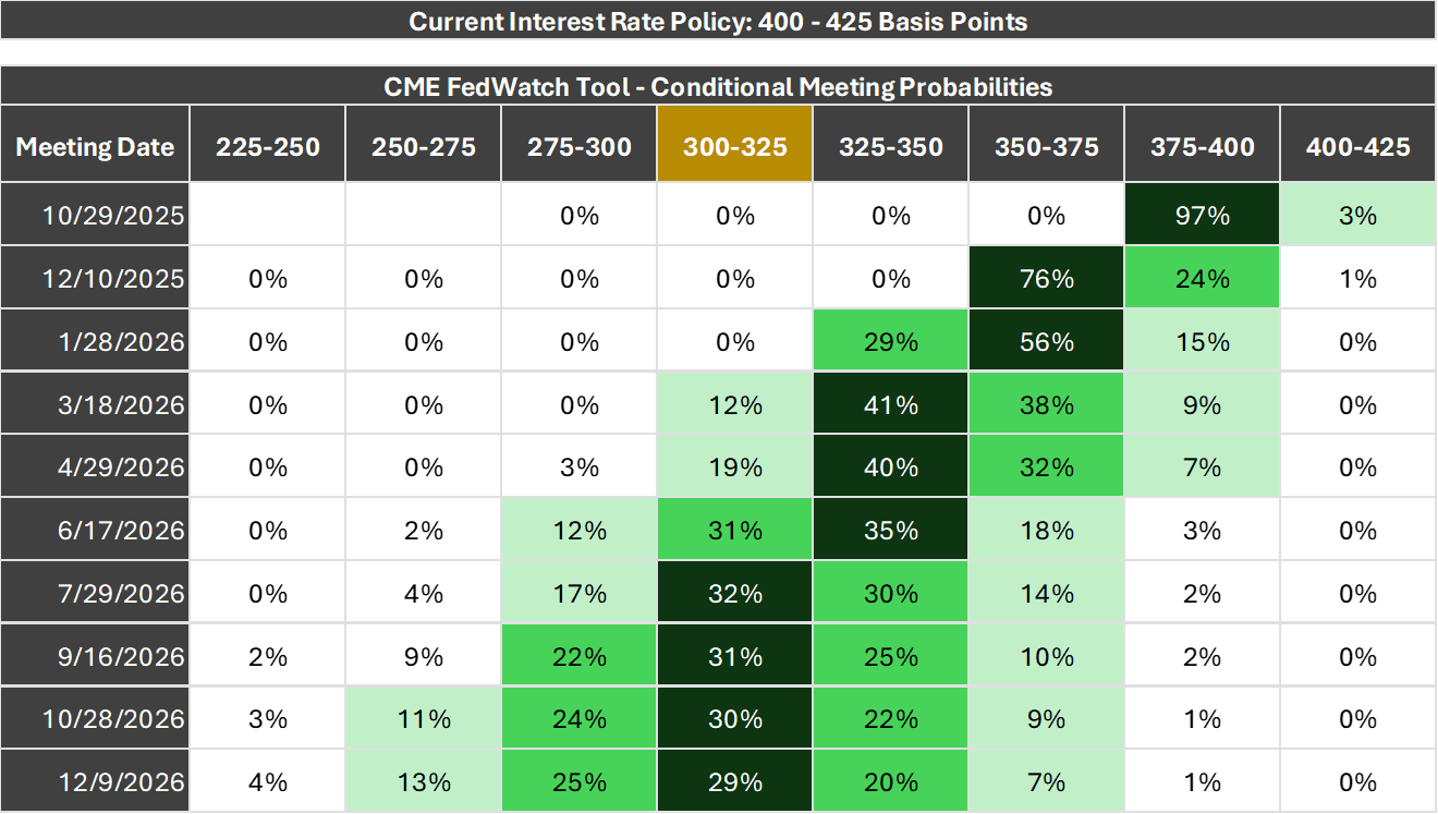 About this Slide: This chart is a probability distribution table showing where the market believes the Fed Funds rate will be following upcoming Federal Reserve Interest Rate Policy Meetings, the dates of which are listed in the column on the far left. The probabilities listed in the table are all derived from the prices of Fed Funds Futures Contracts that trade throughout the day. The logic behind the calculations is that the current prices of various Fed Funds Futures Contracts only makes sense if these probabilities correctly reflect investor expectations. Of course, this does not mean investors will be right or the future will unfold according to the expectations investors have today.