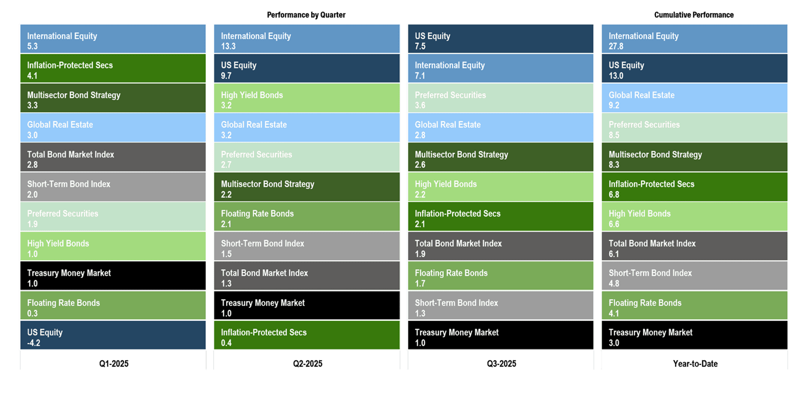 Key Takeaways: Through the first three quarters of 2025, every market segment posted a positive total return. Notably, cash has been the lowest-performing asset class this year, even against a backdrop of shifting policy in Washington that has created economic uncertainty, standoffs between political parties, and intensifying divisions over social issues.