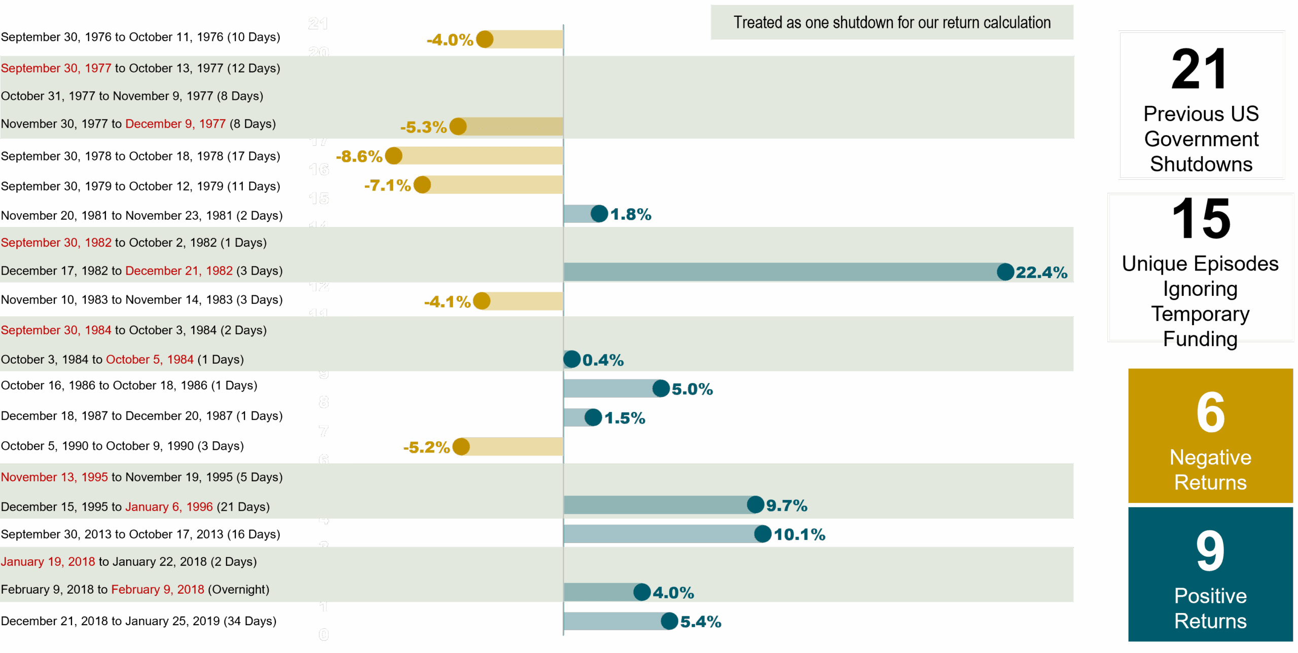 Key Takeaways: While news headlines might paint a scary picture of the potential ramifications of a government shutdown, history reveals no clear relationship between shutdowns and stock market returns. From an investment standpoint, this isn’t a high conviction event that should influence changes to one’s portfolio or investment strategy.