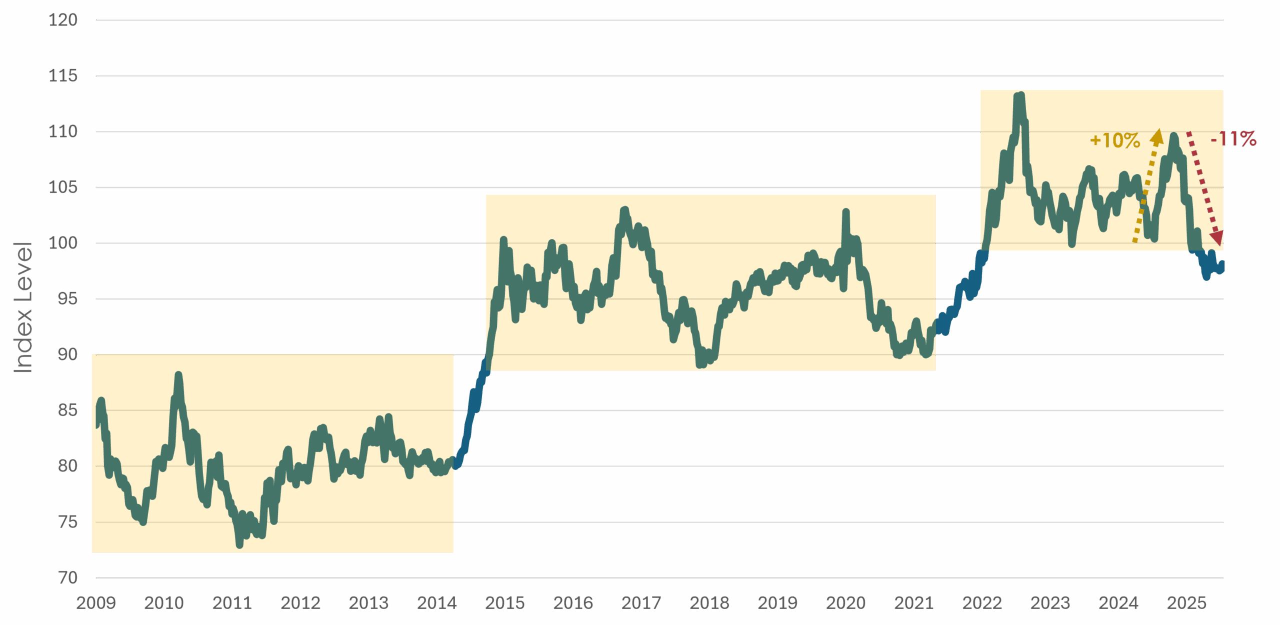 Key Takeaways: While many headlines have focused on the U.S. dollar’s ~11% decline since January—prompting questions about whether to shift assets into foreign currencies—it’s important to zoom out for context. After last November’s presidential election, the dollar index surged nearly 10% through early January, only to give back those gains in the months that followed. Today, the dollar index sits slightly below its pre-election level. Stepping further back, the dollar has spent the past three years oscillating within a 100–120 range, peaking in 2022 at the onset of the war in Ukraine. Looking back fifteen years, a broader pattern emerges: the dollar tends to consolidate for long periods within a 20% band until a catalyst pushes it into a new range. Over that time, the prevailing trend has been upward.