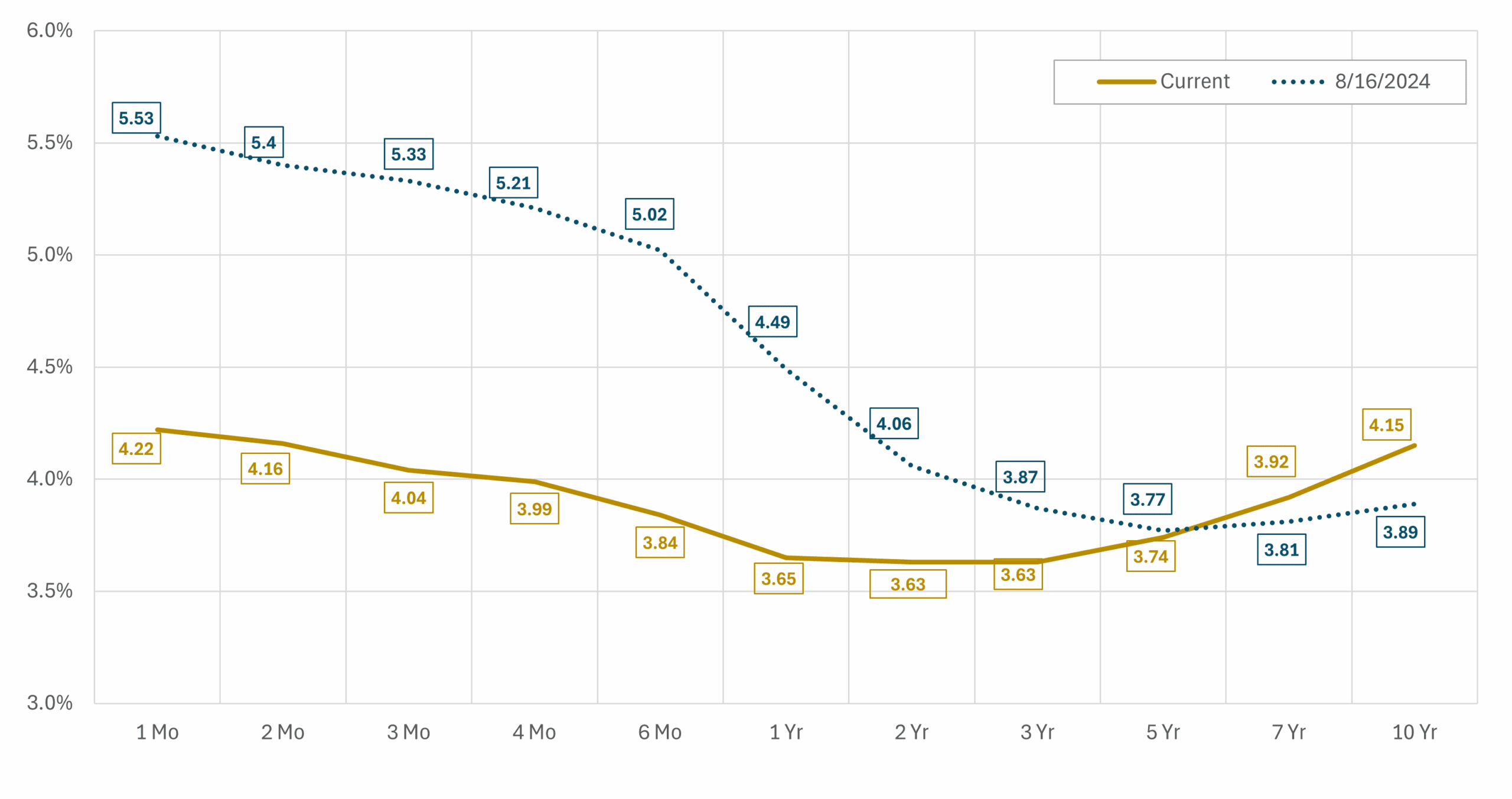 About this Chart: This chart shows the treasury yield curve as of 8/16/2024—one month before the first interest rate cut of the current cycle—and 9/30/2025.