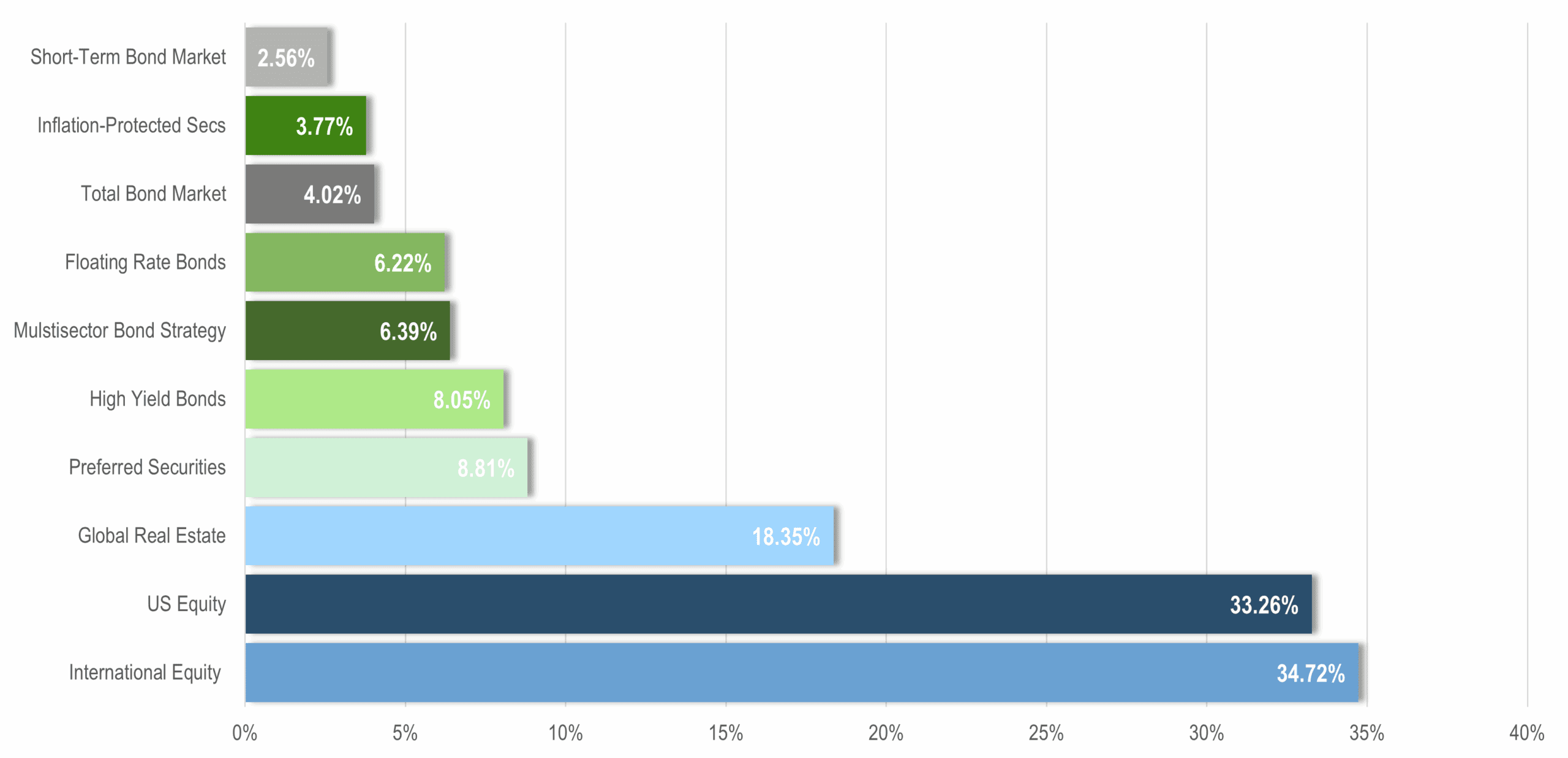 Data Disclosures: Treasury Money Market: Fidelity Treasury Money Market. Short-Term Bond Index: Vanguard Short-Term Bond Index. Total Bond Market Index: Vanguard Total Bond Market Index. Inflation-Protected Treasuries: Vanguard Inflation-Protected Securities. Multisector Bond Strategy: PIMCO Income. Floating Rate Bonds: Fidelity Floating Rate. High Yield Bonds: PIMCO High Yield. Preferred Securities: Nuveen Preferred Securities. US Stocks: DFA US Core Equity I. Foreign Stocks: DFA World ex US Core Equity. Global Real Estate: DFA Global Real Estate. Data source: Morningstar Direct.